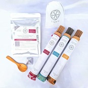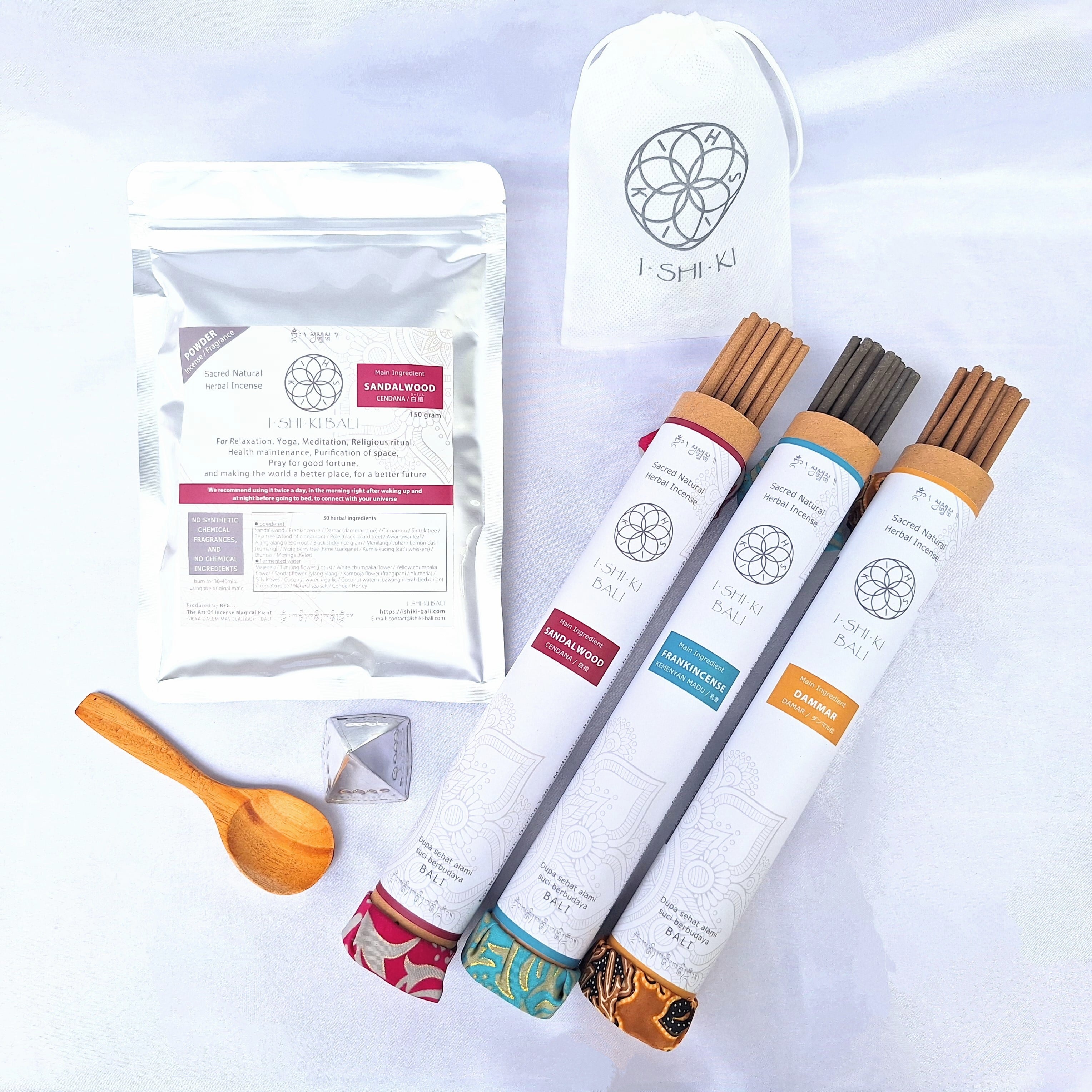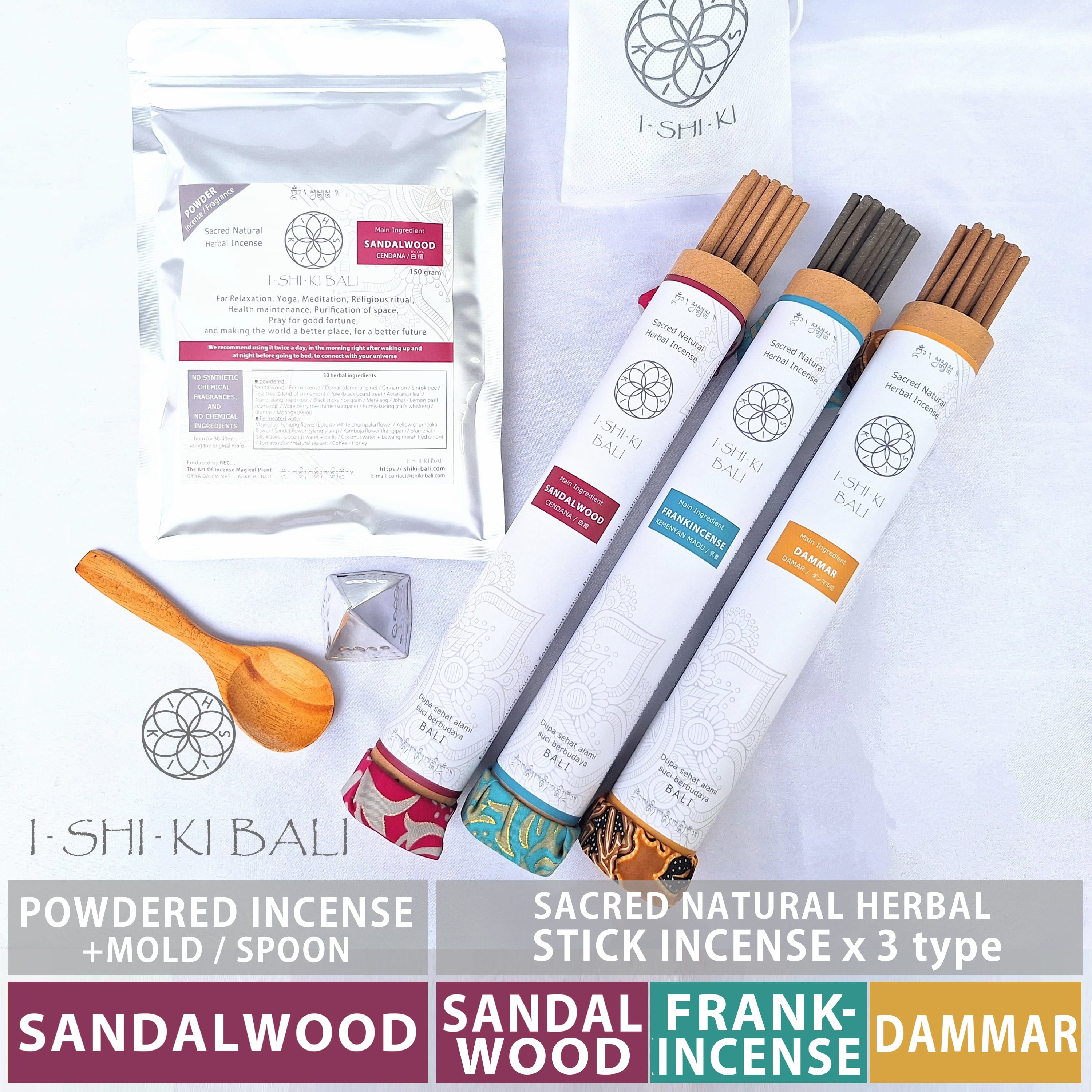 お試し6点基本セット◆神聖な天然ハーブ香 1:サンダルウッド 2:フランキンセンス 3:ダマール スティック各21本入 4:粉香150g入 5:抜き型 6:木製スプーン【初回限定】 | 神聖な天然ハーブのお香を地球・バリ島から | ISHIKI-BALI