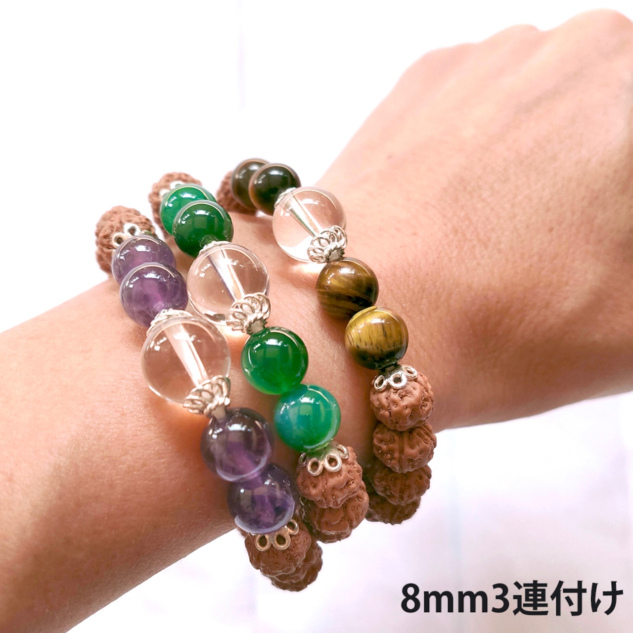 ※ルドラクシャは、実が小さいほど効果が髙いという説がありますが、デザイナー自身、7mm珠を愛用していた期間に宇宙の法則・本質に繋がるきっかけを得たため、この時の体験から同等サイズ(6mm、8mm)でデザインしています。